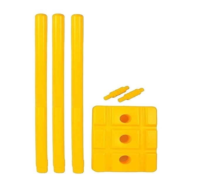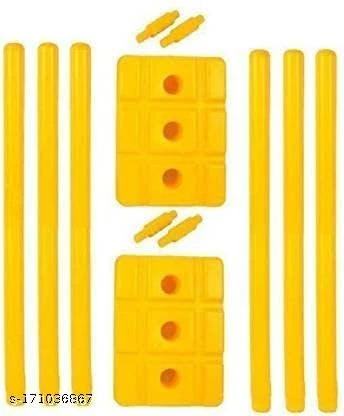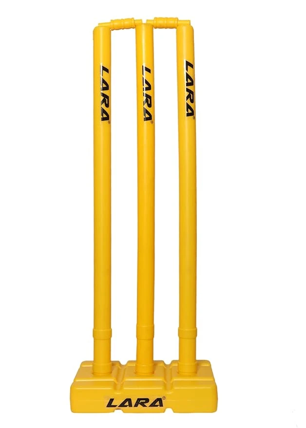 LARA Heavy Plastic cricket stumps set consists of 6 Heavy Plastic stumps, 4 bails, 2 Stand. The stumps are placed along the batting crease with equal distances between each stump. They are positioned so they are wide enough. The bails are placed on top of the stumps.