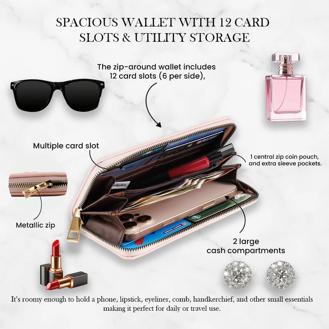 Spacious Wallet with 12 Card Slots & Utility Storage: Made from premium Pink faux leather with a charming gold bow embellishment. The zip-around wallet includes 12 card slots (6 per side), 2 large cash compartments, 1 central zip coin pouch, and extra sleeve pockets. It’s roomy enough to hold a phone, lipstick, eyeliner, comb, handkerchief, and other small essentials – making it perfect for daily or travel use.