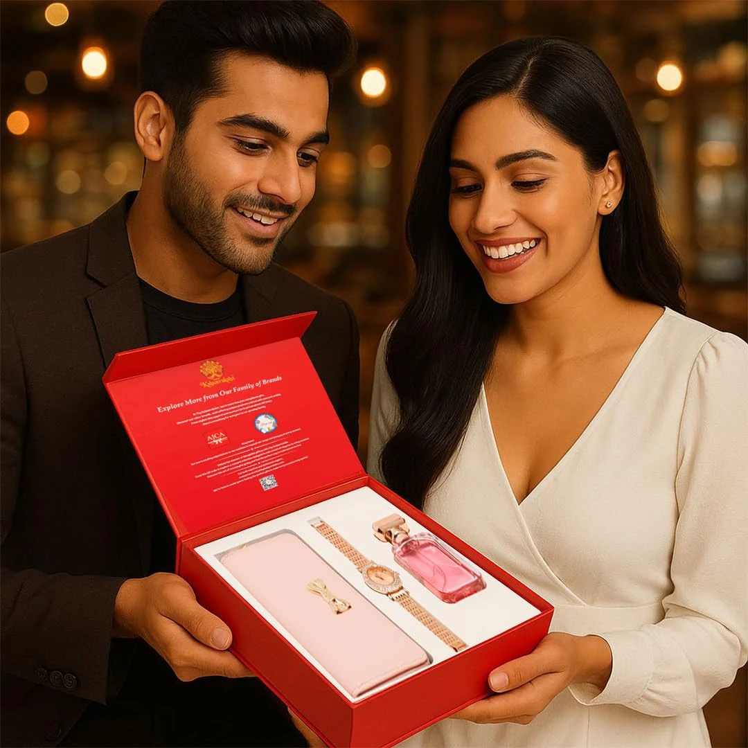 3-in-1 Premium Gift Set for Her: A thoughtful and elegant combo featuring a multi-utility women’s wallet, a stylish rose gold wristwatch, and a 50ml luxury perfume. A complete gifting solution for birthdays, anniversaries, Karwa Chauth, Rakhi, Diwali, and corporate events.