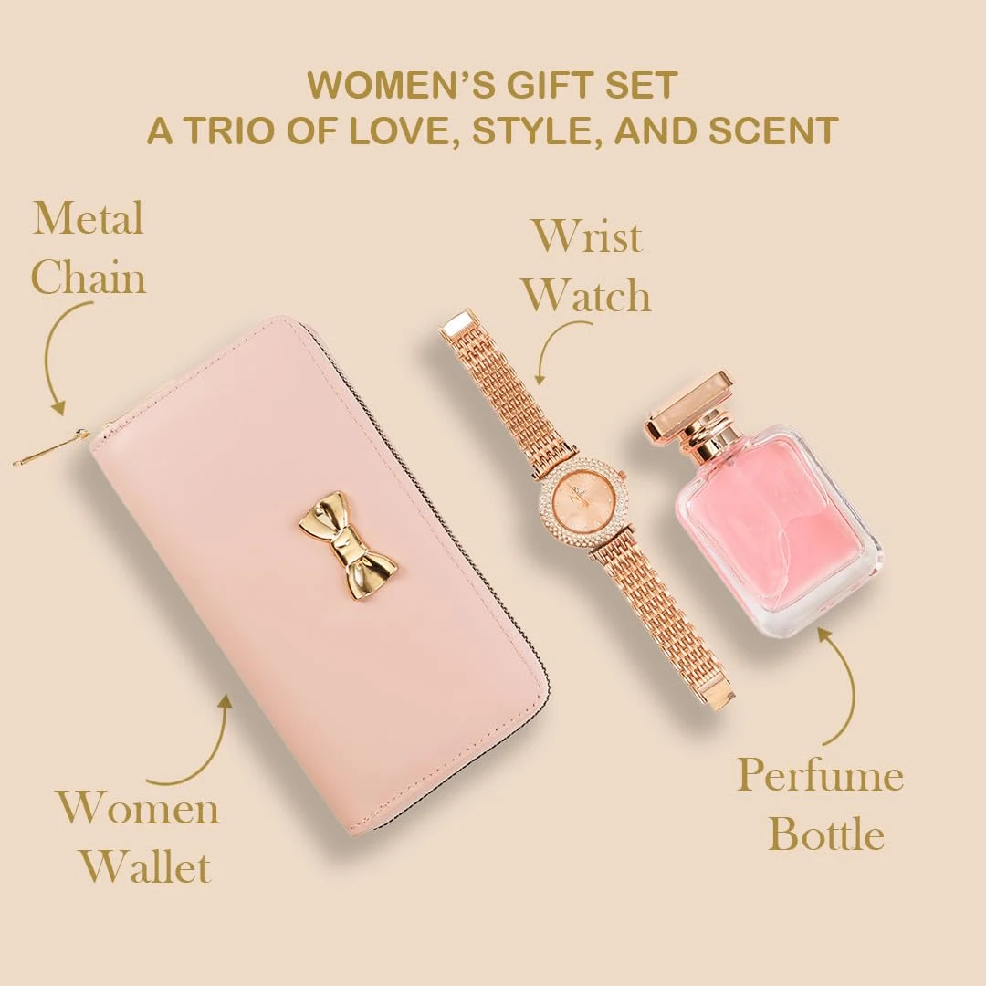 3-in-1 Premium Gift Set for Her: A thoughtful and elegant combo featuring a multi-utility women’s wallet, a stylish rose gold wristwatch, and a 50ml luxury perfume. A complete gifting solution for birthdays, anniversaries, Karwa Chauth, Rakhi, Diwali, and corporate events.